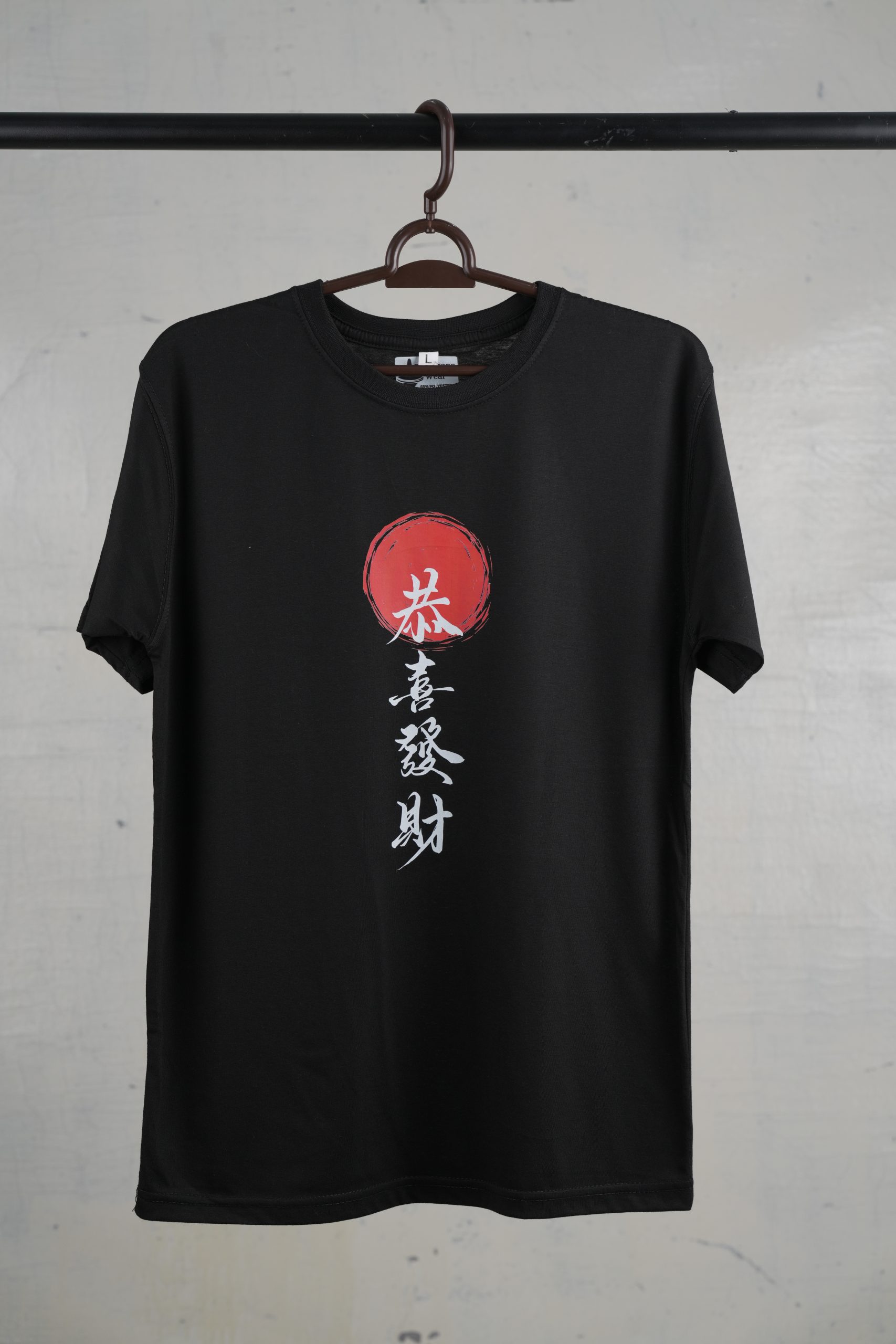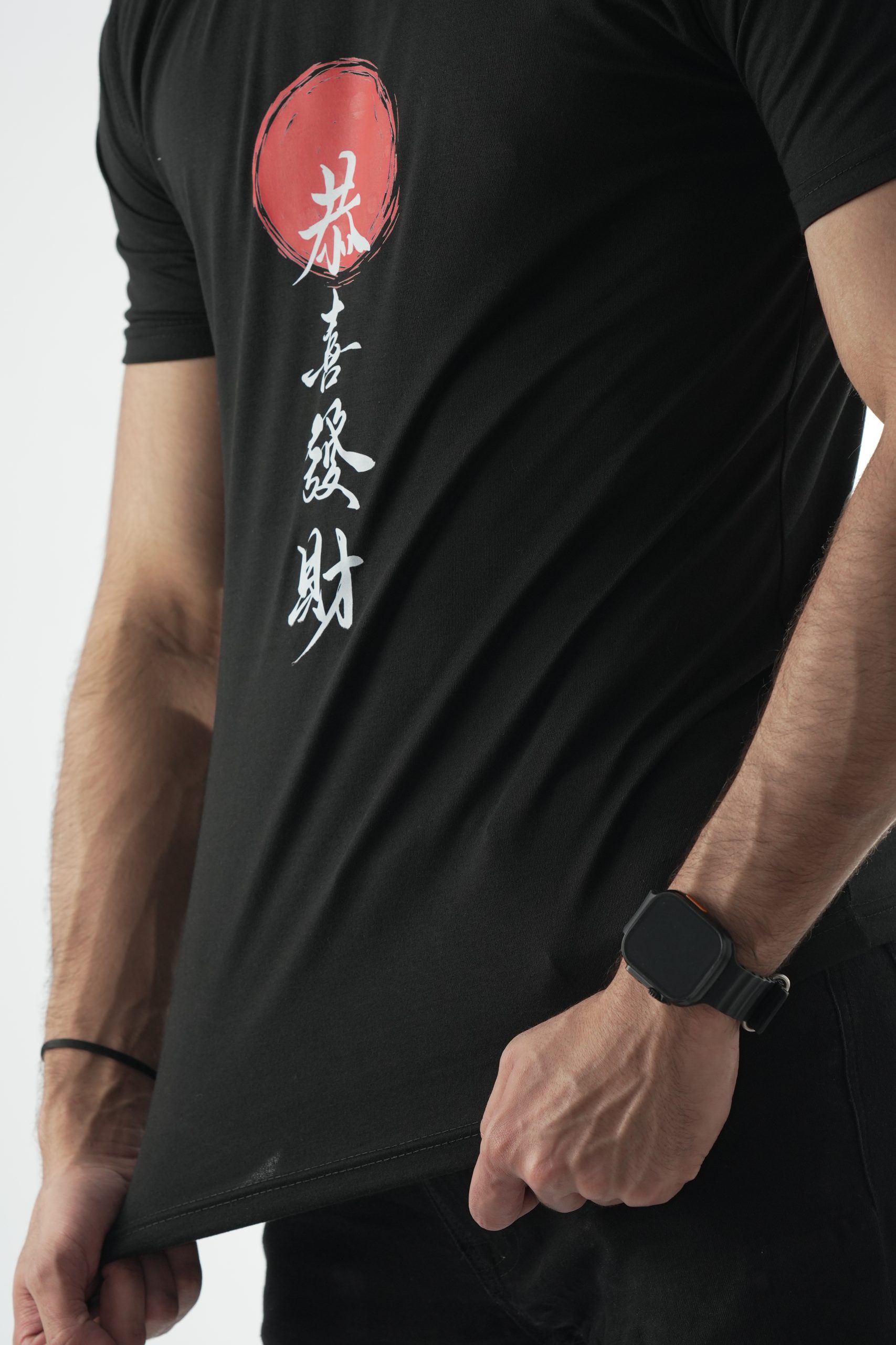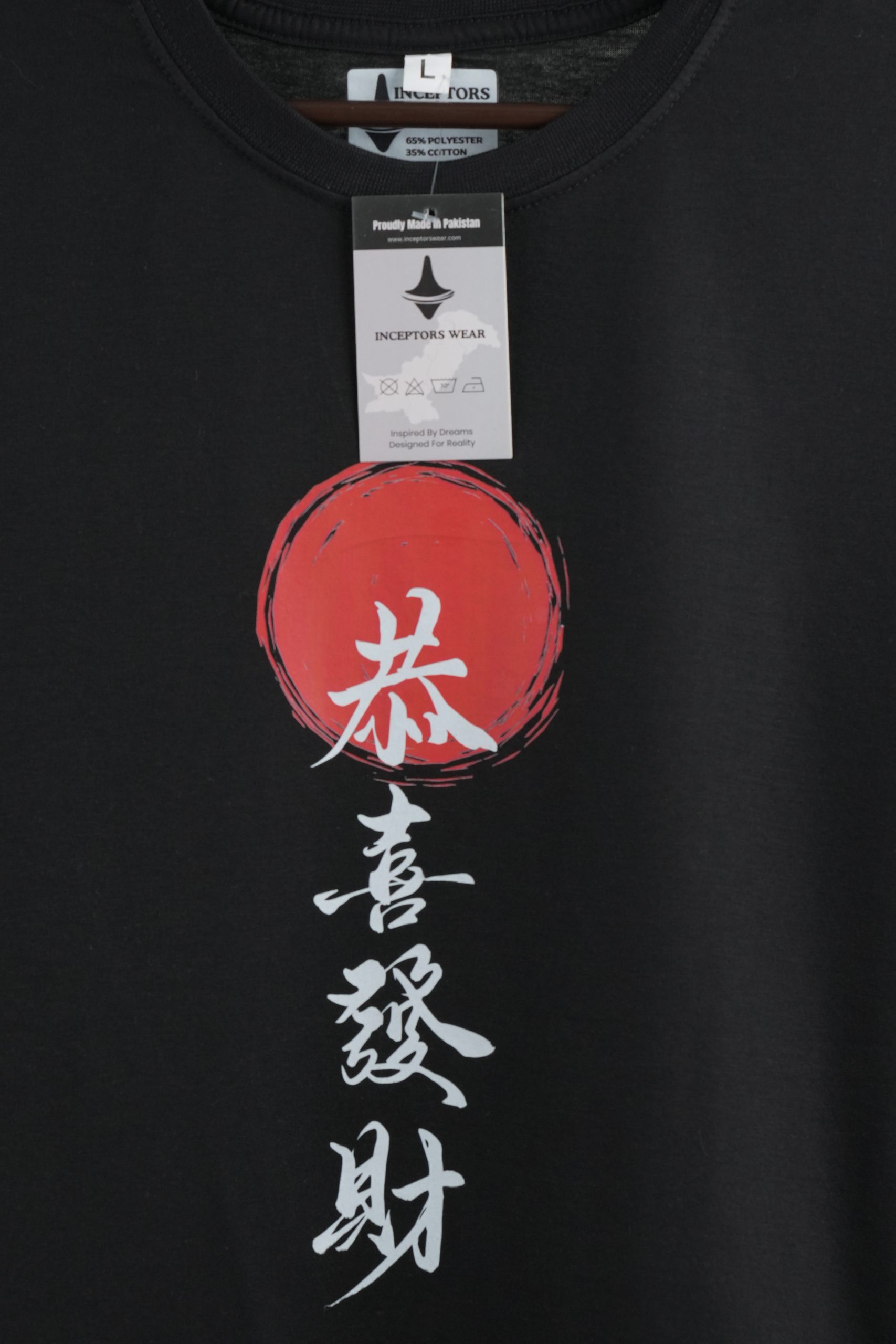 Make a bold statement with this stylish black T-shirt featuring traditional Chinese calligraphy and a striking red sun graphic.
