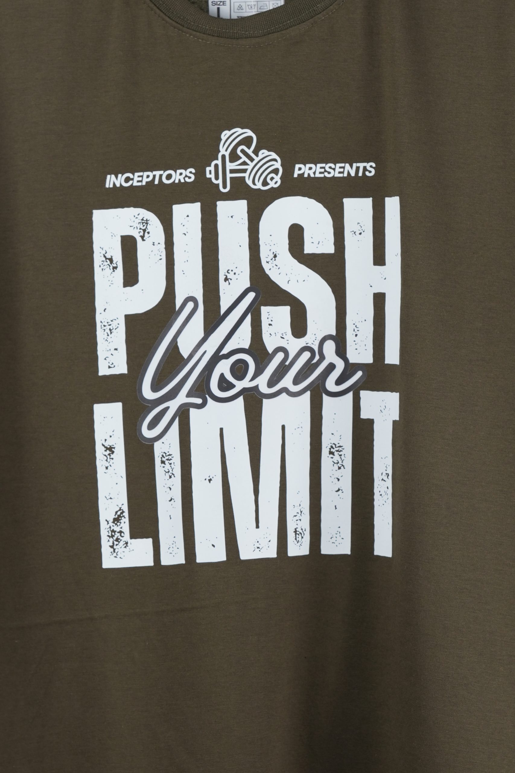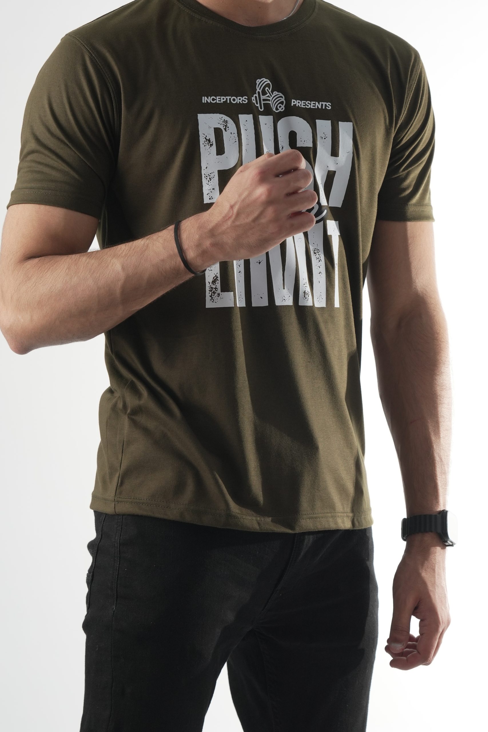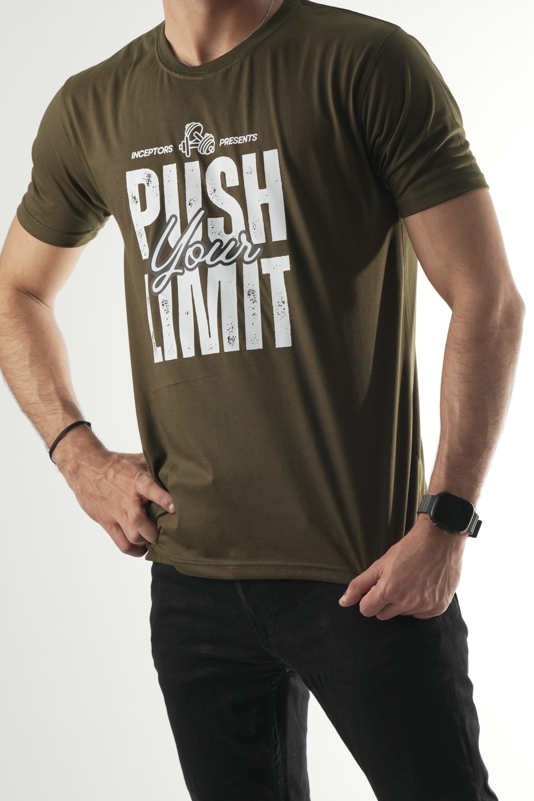 Unleash your potential with the Inceptors Wear Push Your Limit T-shirt. Crafted from premium quality fabric, this olive-green tee offers a perfect balance of style, comfort, and durability. Its bold and inspiring design makes it an ideal choice for gym enthusiasts and casual wear lovers alike. Whether you're hitting the weights or hanging out with friends, this tee keeps you motivated and looking fresh.